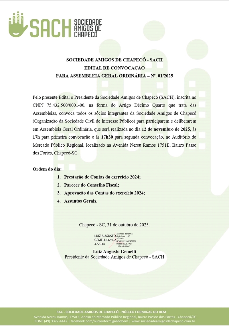 EDITAL DE CONVOCAÇÃO PARA ASSEMBLEIA GERAL ORDINÁRIA – Nº. 01/2025